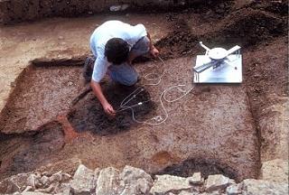 Bild 2 Außerhalb der Umfassungsmauer wurden 2 Feuerstellen gefunden, die hier mit einem Pantographen bzw. Storchenschnabel aufgenommen werden. Mittels einer C14-Analyse soll das Alter der Holzkohlenreste bestimmt werden. |